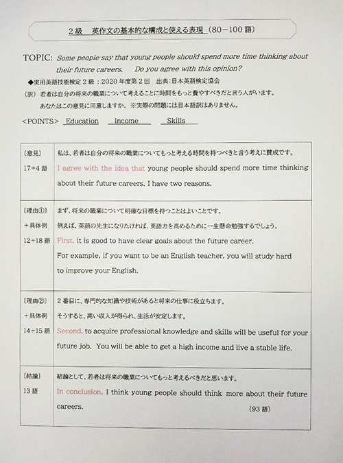 参考までに、日本英語検定協会の実用英語技能検定2級(2020.2回)の英作文を紹介させていただきます(私のオリジナルの答案用紙です)。